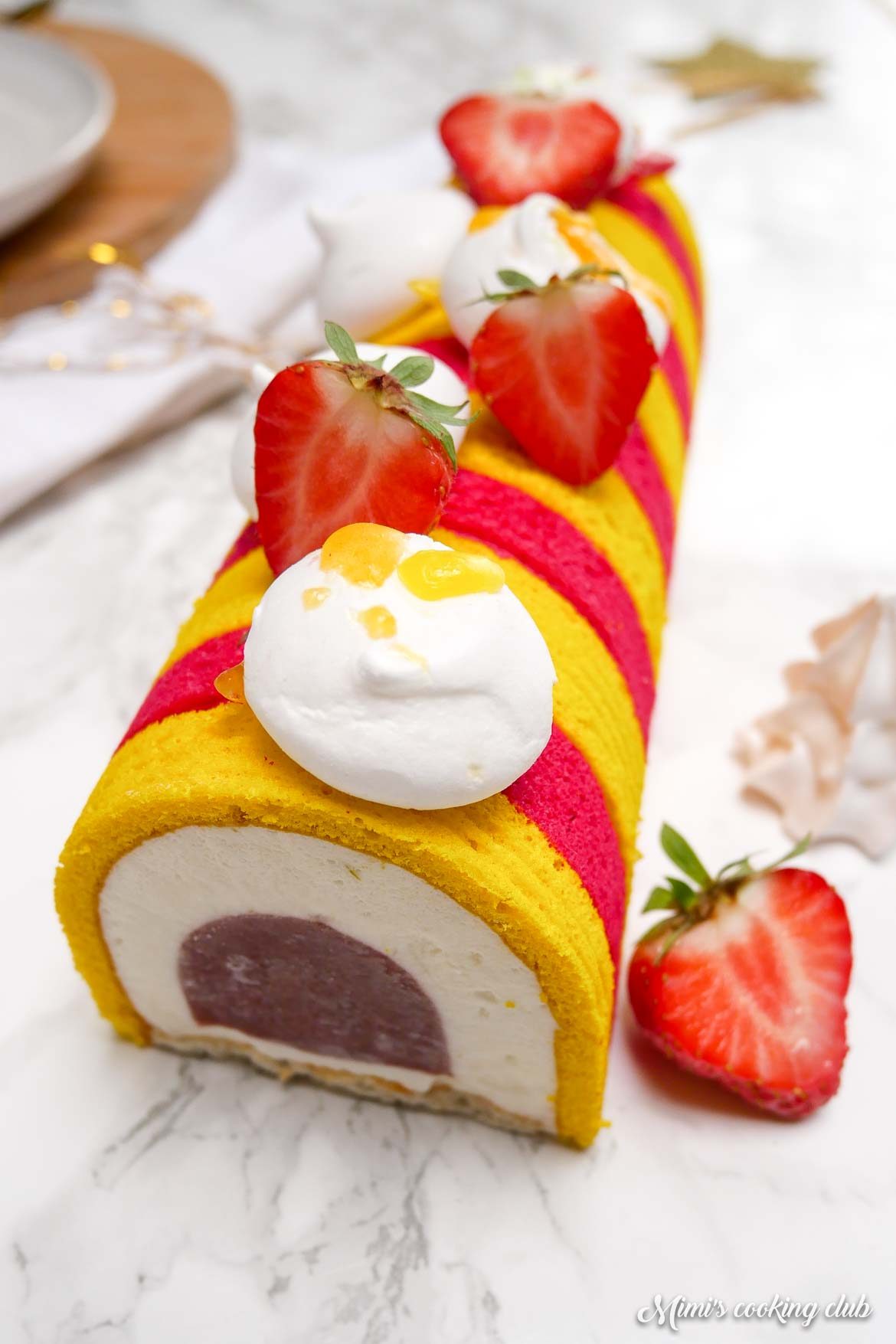 La bûche petite arlequine est composée d’un biscuit arlequin à la cuillère ligné jaune et rose, de petites meringues arlequines, d’une crème au citron vert, d’un palet de fraise et d’un biscuit au citron. Vous êtes toujours là ? 🙂